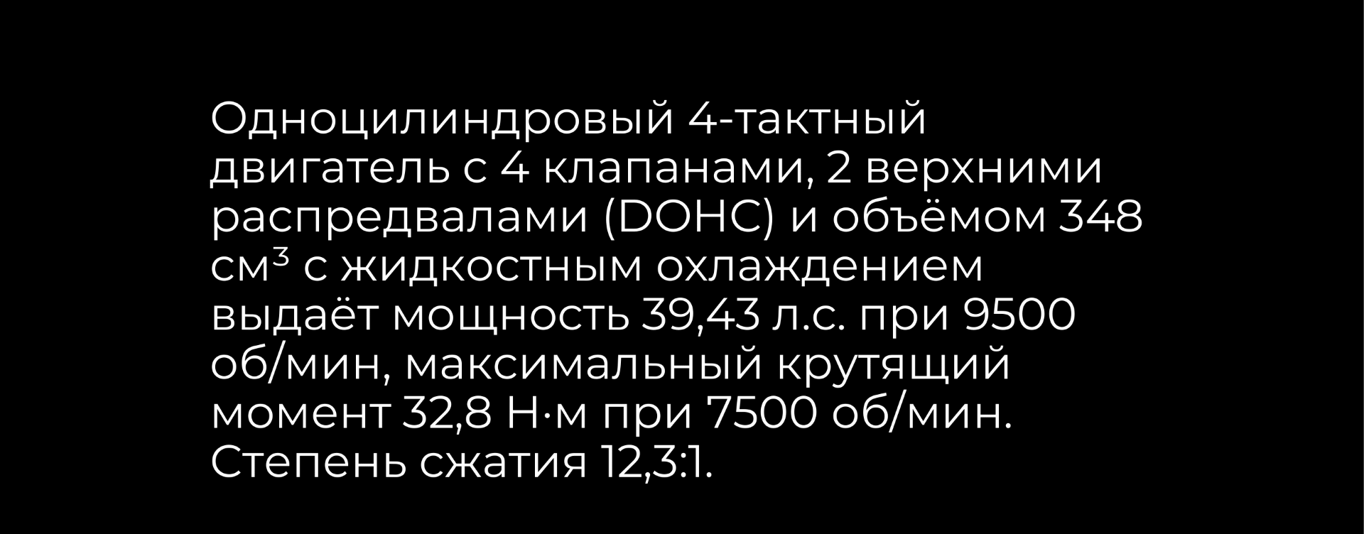 Силовая установка представлена одноцилиндровым 4-тактным двигателем с 4 клапанами и 2 верхними распредвалами. Объём двигателя 348 см³, мощность 39 л.с. Оснащён инжектором BOSCH и системой жидкостного охлаждения. 6-ступенчатая трансмиссия. Запуск двигателя осуществляется с помощью бесключевого доступа.