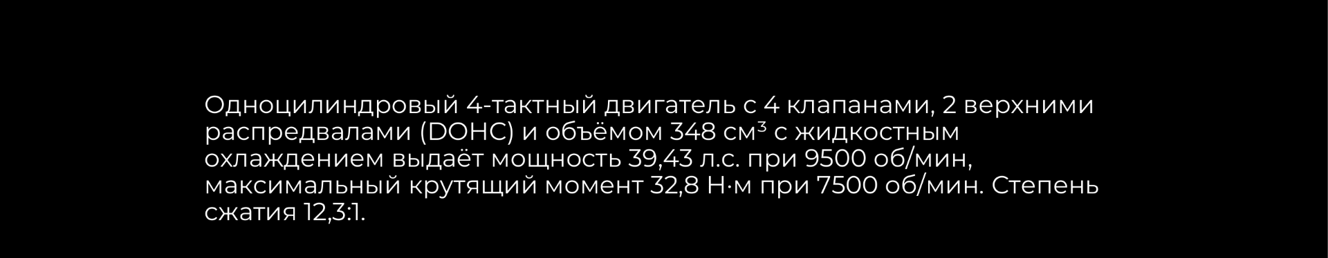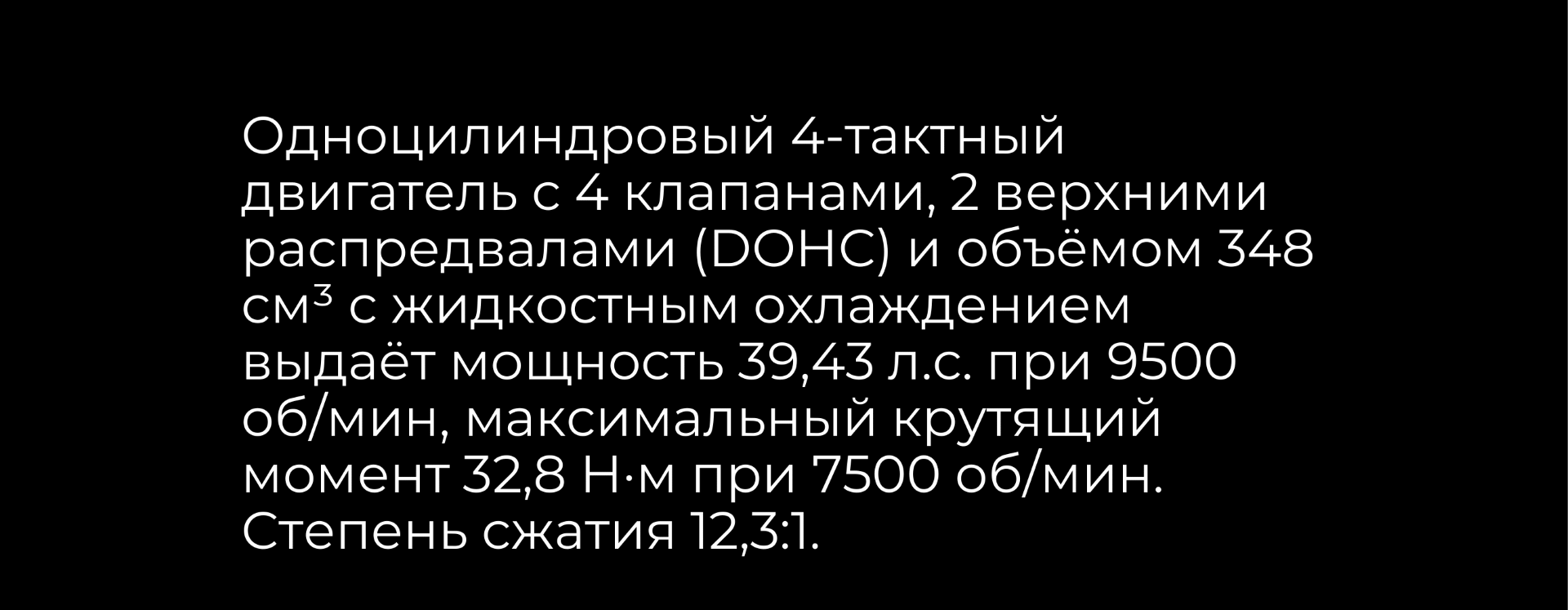 Силовая установка представлена одноцилиндровым 4-тактным двигателем с 4 клапанами и 2 верхними распредвалами. Объём двигателя 348 см³, мощность 39 л.с. Оснащён инжектором BOSCH и системой жидкостного охлаждения. 6-ступенчатая трансмиссия. Запуск двигателя осуществляется с помощью бесключевого доступа.