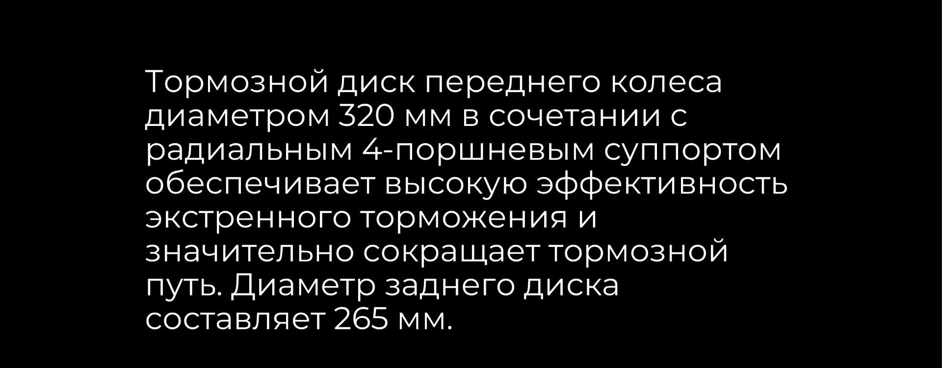 Тормозная система произведена испанской компанией J.JUAN, входящей в холдинг BREMBO. Это дисковая гидравлическая система с 4-поршневым суппортом спереди и однопоршневым сзади.
