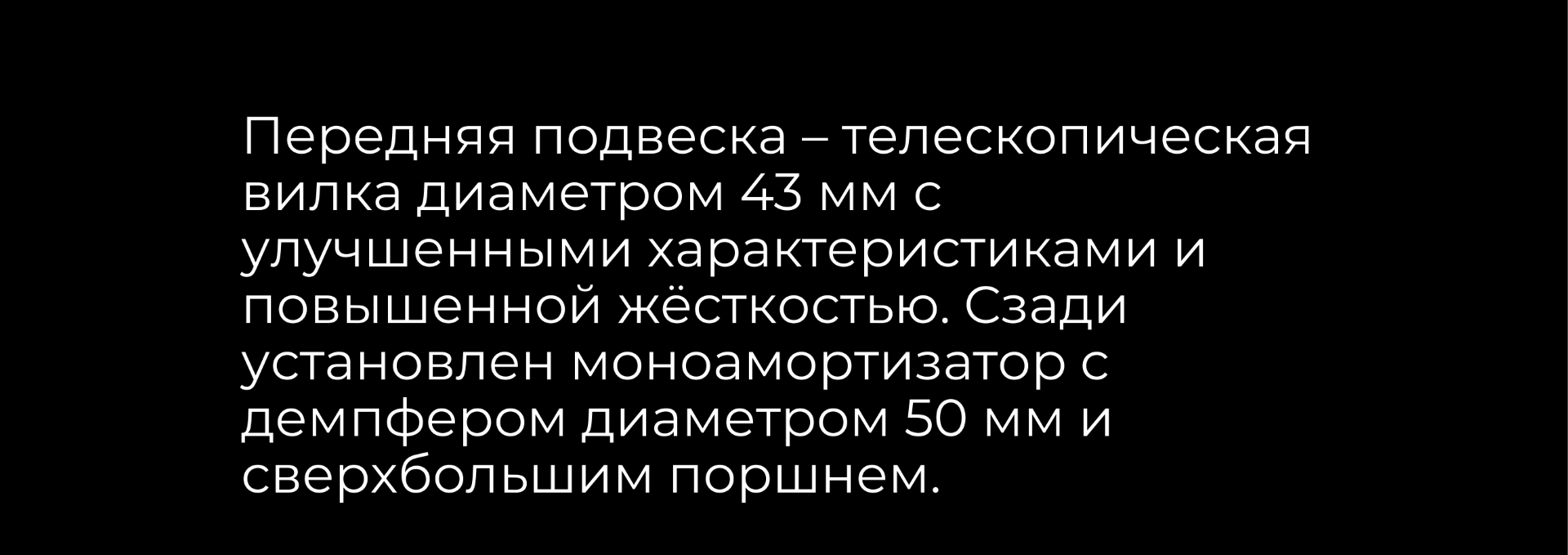 Подвеска спереди представлена телескопической вилкой, а сзади используется двусторонний маятник из литого под давлением алюминия с центральным амортизатором и регулировкой преднатяга.