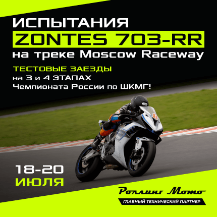 С 18 по 20 июля на автодроме Moscow Raceway состоятся 3-й и 4-й этапы Чемпионата России по шоссейно-кольцевым мотогонкам, где примет участие наш спортбайк ZONTES 703-RR совместно с Роллинг Мото – главным техническим партнёром чемпионата.